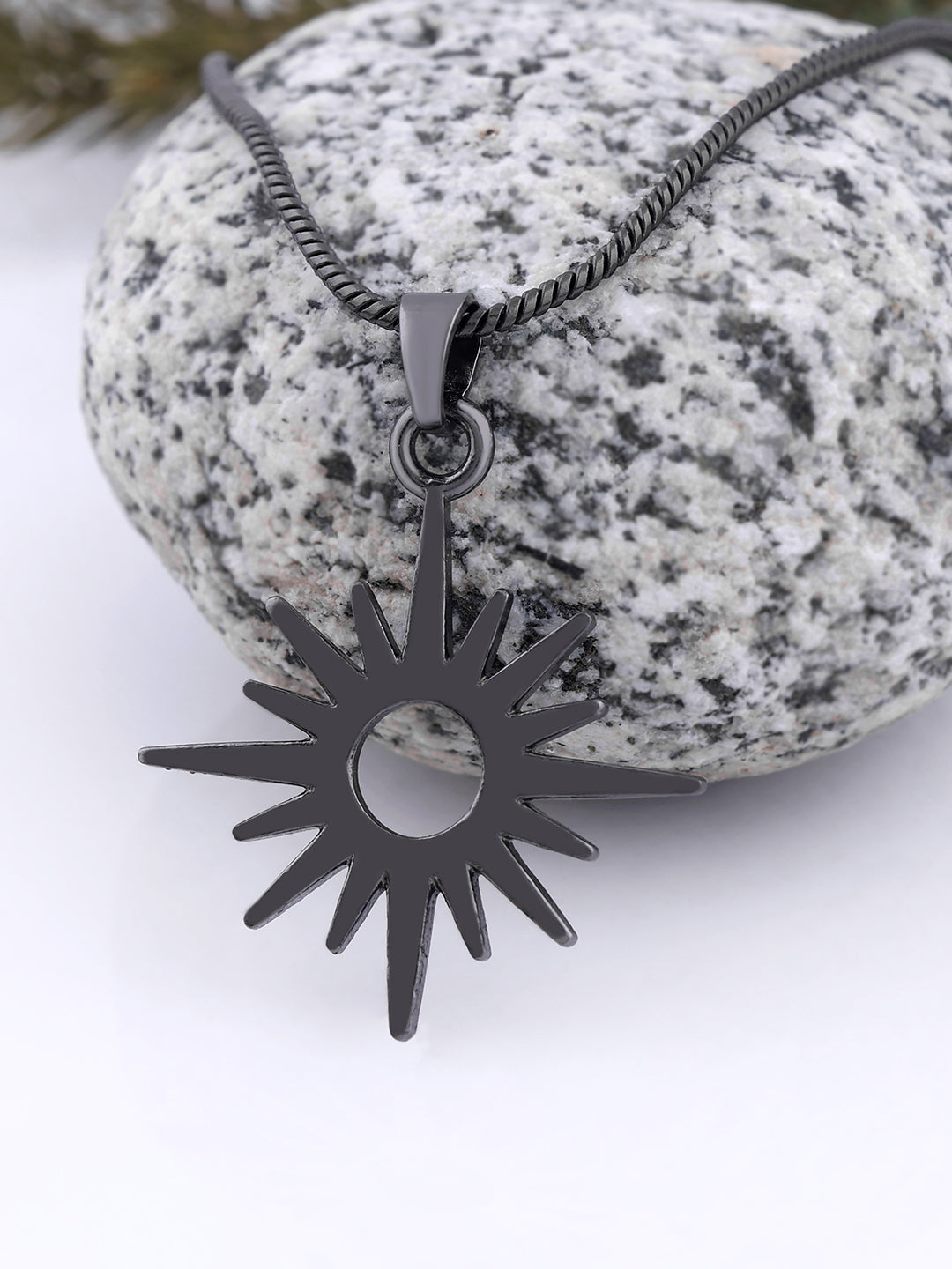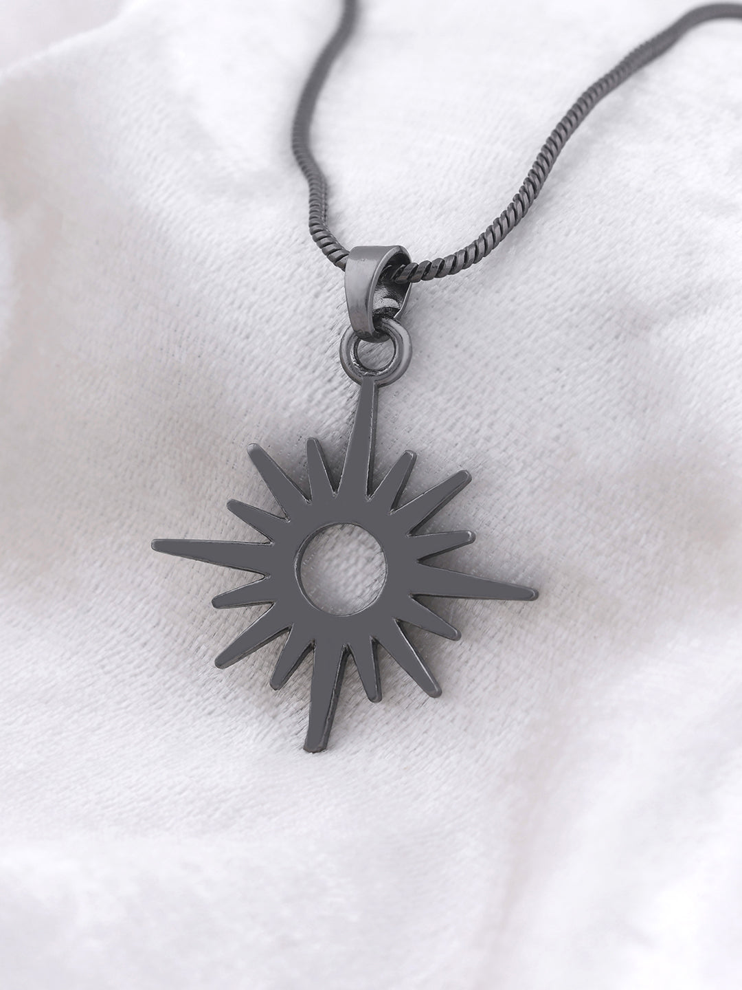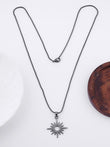 Intricate Starburst Design: The pendant features a dynamic, multi-pointed starburst (often resembling a stylized compass rose or the North Star) centered around an open circle, creating a powerful focal point.
