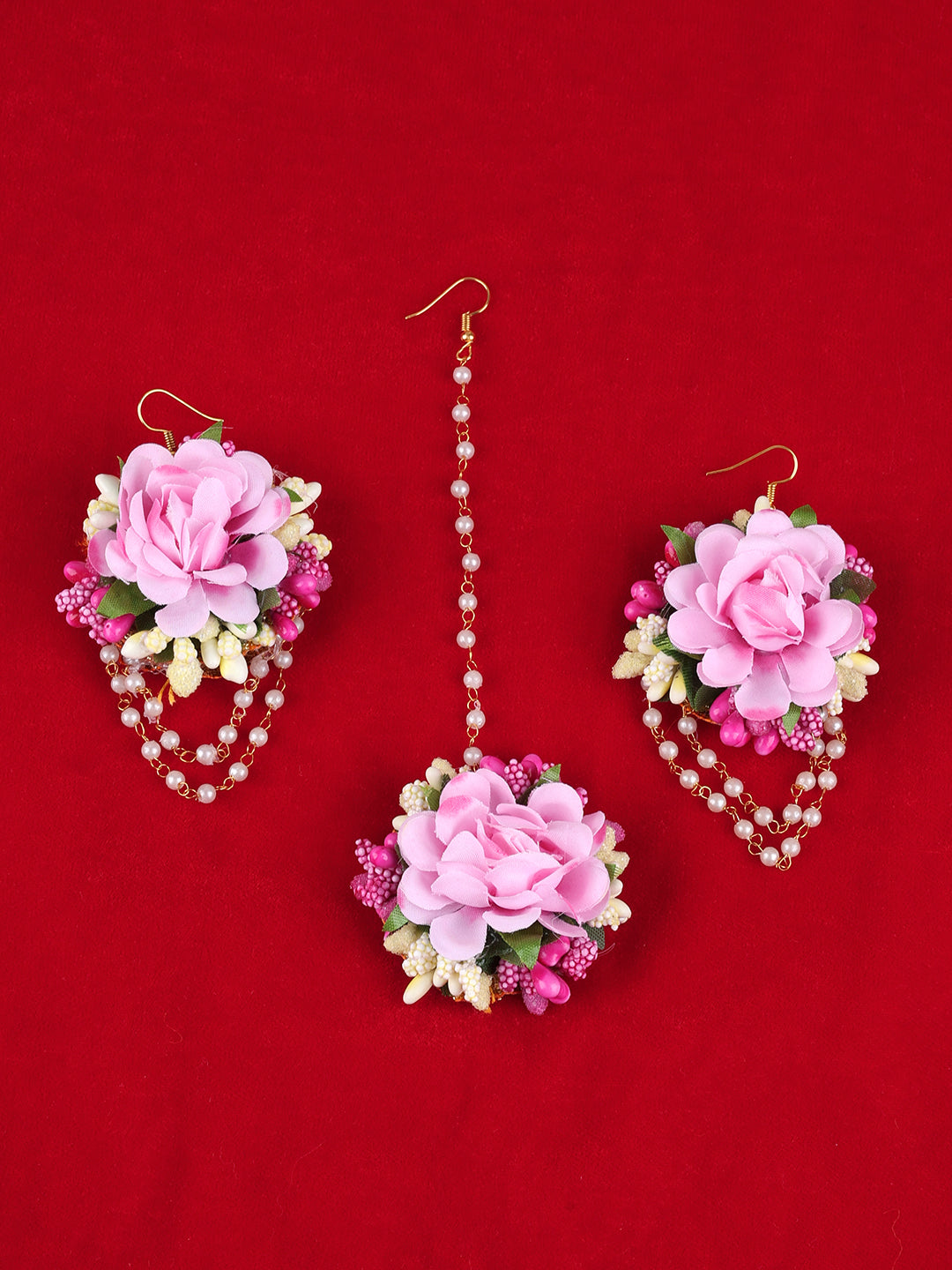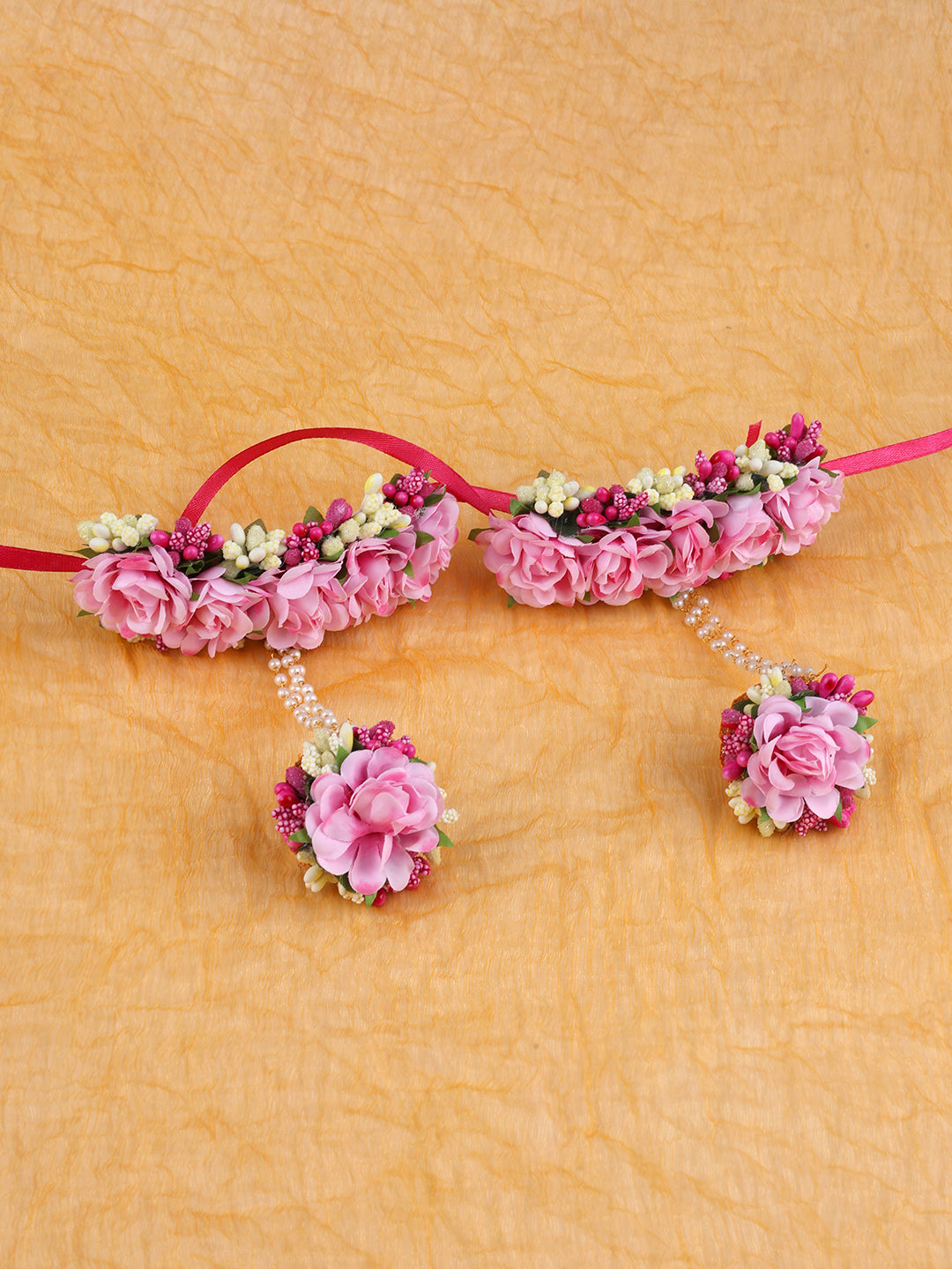 Embrace the charm of tradition with this exquisite, soft Pink Floral Jewelry Set, perfect for pre-wedding celebrations like Haldi, Mehendi, or Baby Shower functions. This complete set features delicate artificial pink peony-style flowers interspersed with vibrant pink and white flower buds and complemented by elegant pearl-like droplet accents. The collection includes a stunning, U-shaped necklace, matching floral earrings with pearl chains, a delicate maang tikka (forehead ornament), and comprehensive hathphool (hand ornaments) attached to finger rings. Each piece is designed to be lightweight and finished with adjustable magenta ribbons for a perfect, comfortable fit.