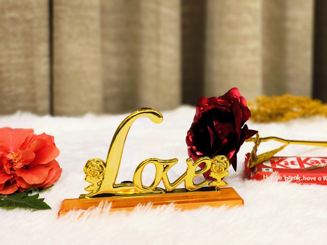 Custom "Love" Base: Comes with a matching gold-finished stand featuring the word "Love" in elegant script, accented by two miniature golden rose motifs.
