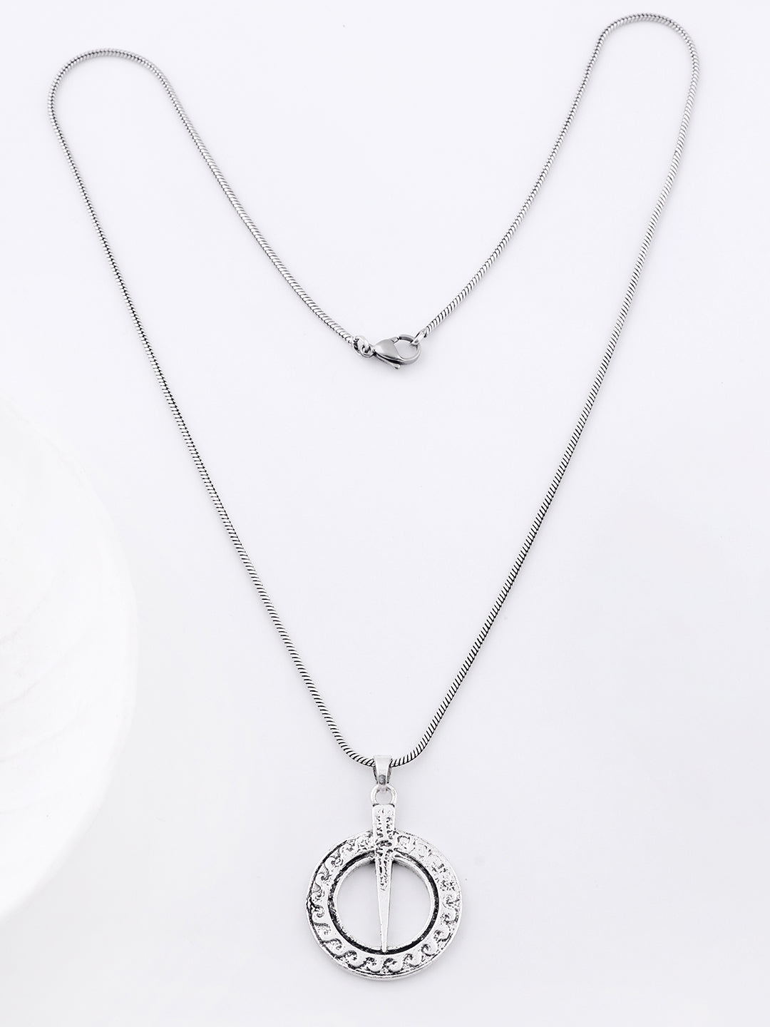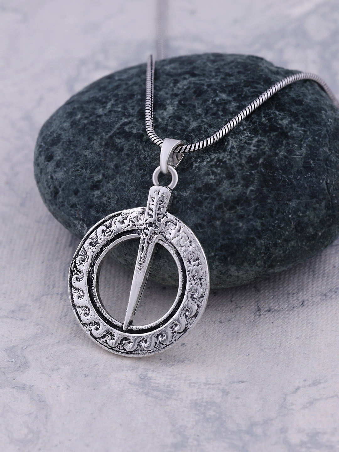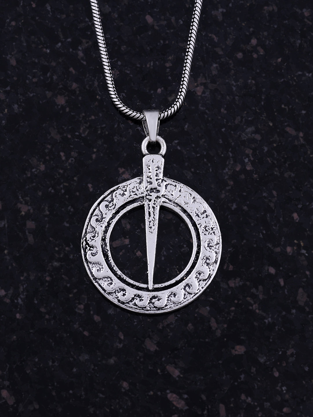 Antique Finish: Features a striking oxidized/antique silver-tone finish that highlights the texture and gives the pendant a rugged, battle-tested look.