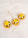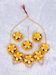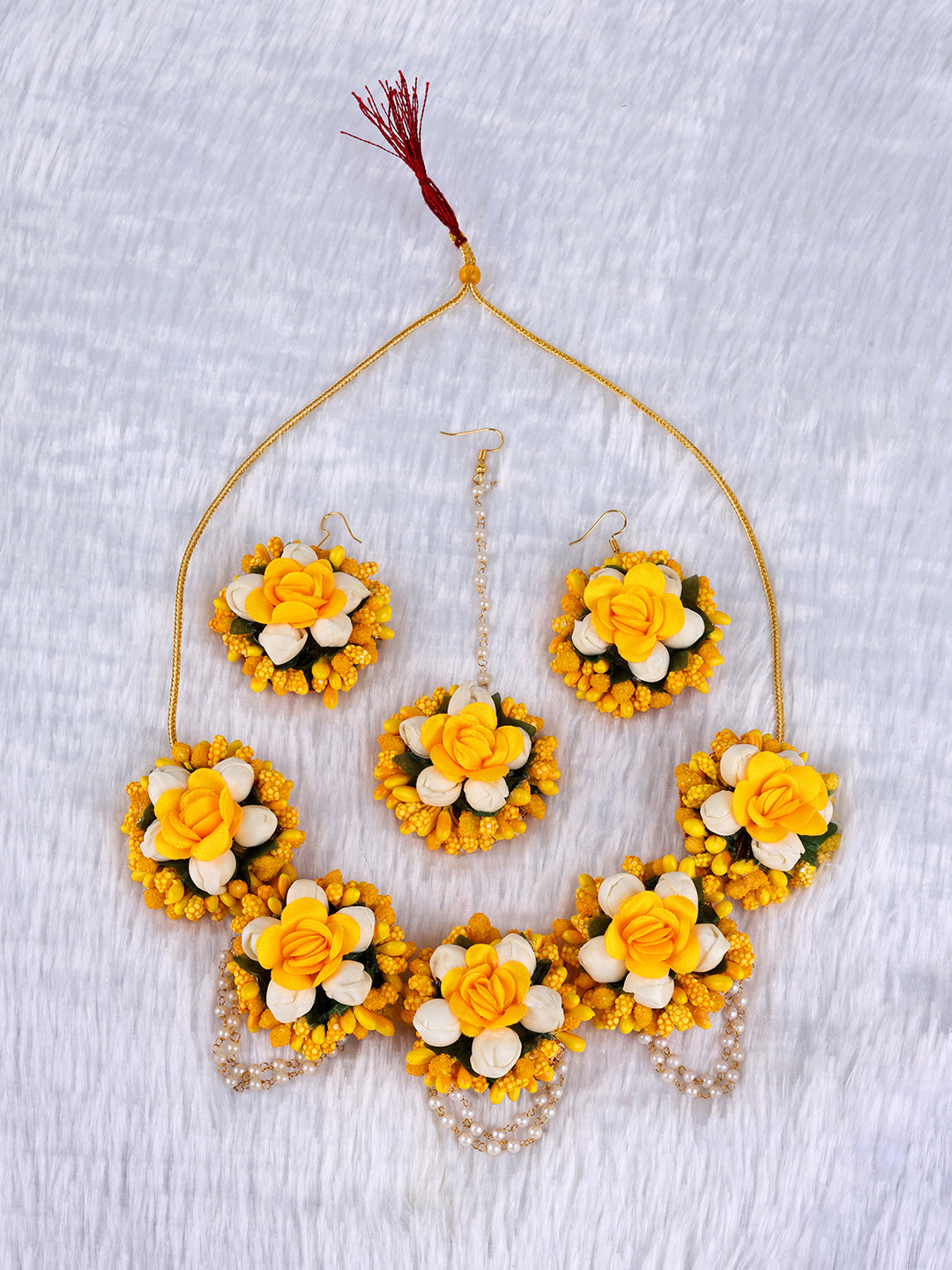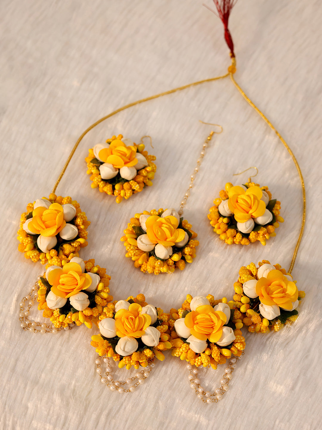 Presenting a cheerful and complete Artificial Floral Jewelry Set, beautifully designed in sunny yellow and crisp white—the perfect colors for a Haldi ceremony. This collection features prominent yellow roses and bright white small buds, accented with tiny yellow pearl clusters for a rich texture.