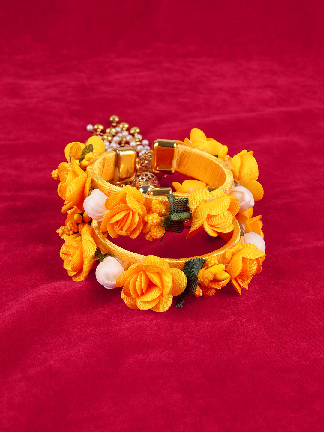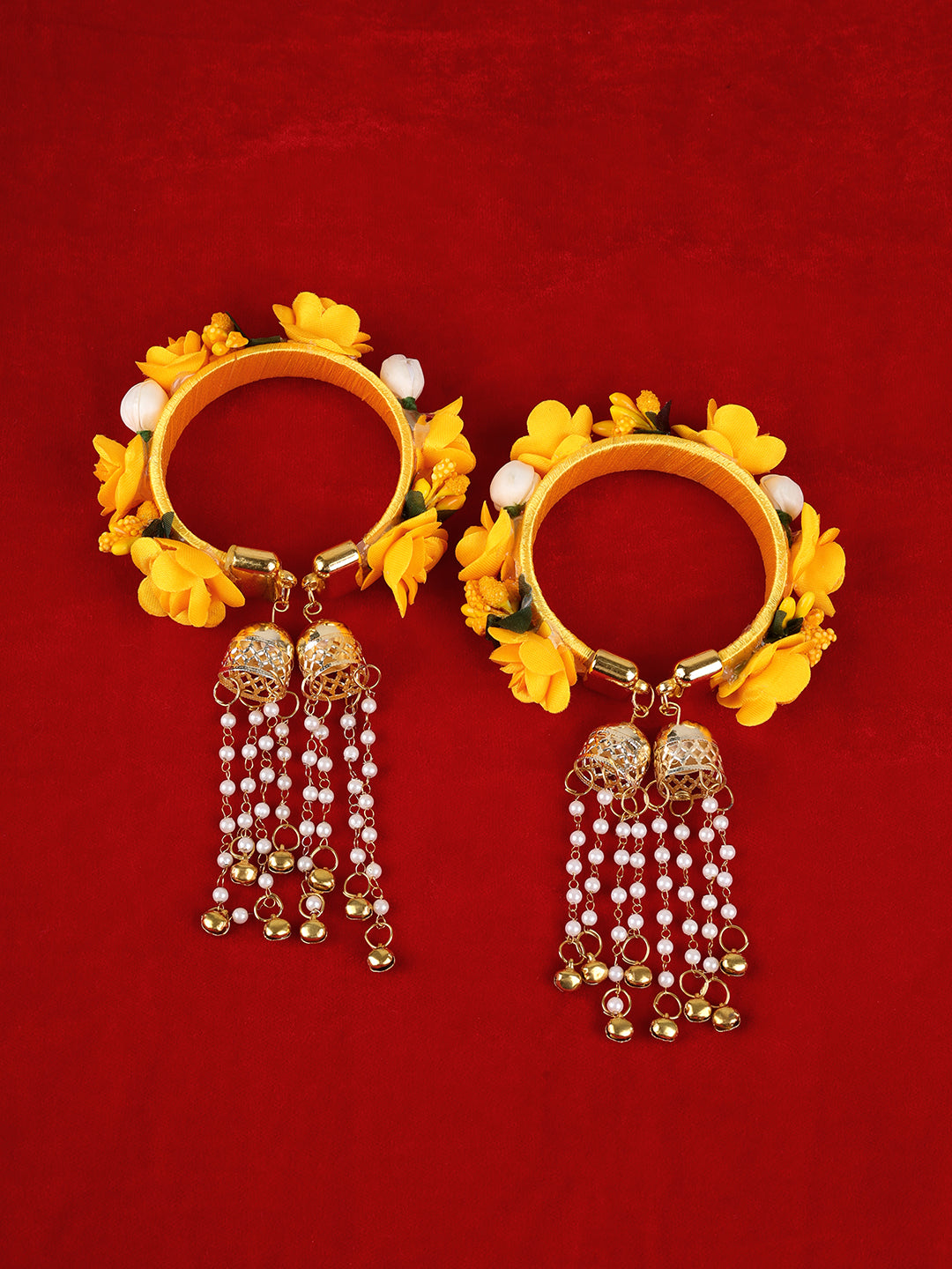 Two floral Bracelets (bangles) adorned with long, elegant gold and pearl beaded tassels.